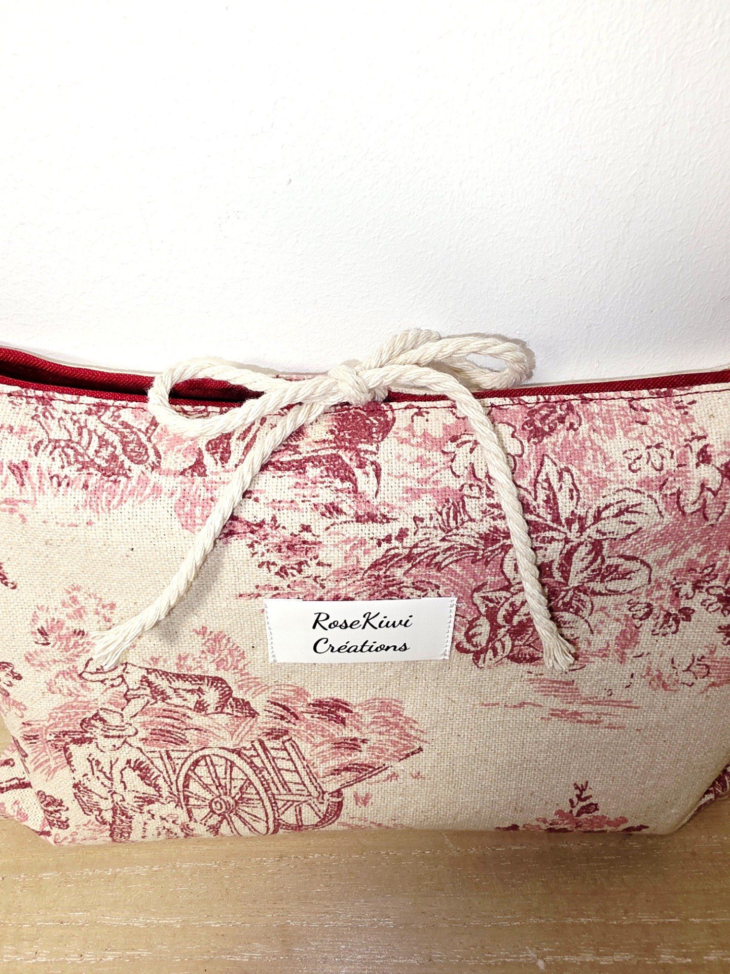 Pochette a livres en toile de Jouy vintage et rétro motifs bordeaux sur fond crème