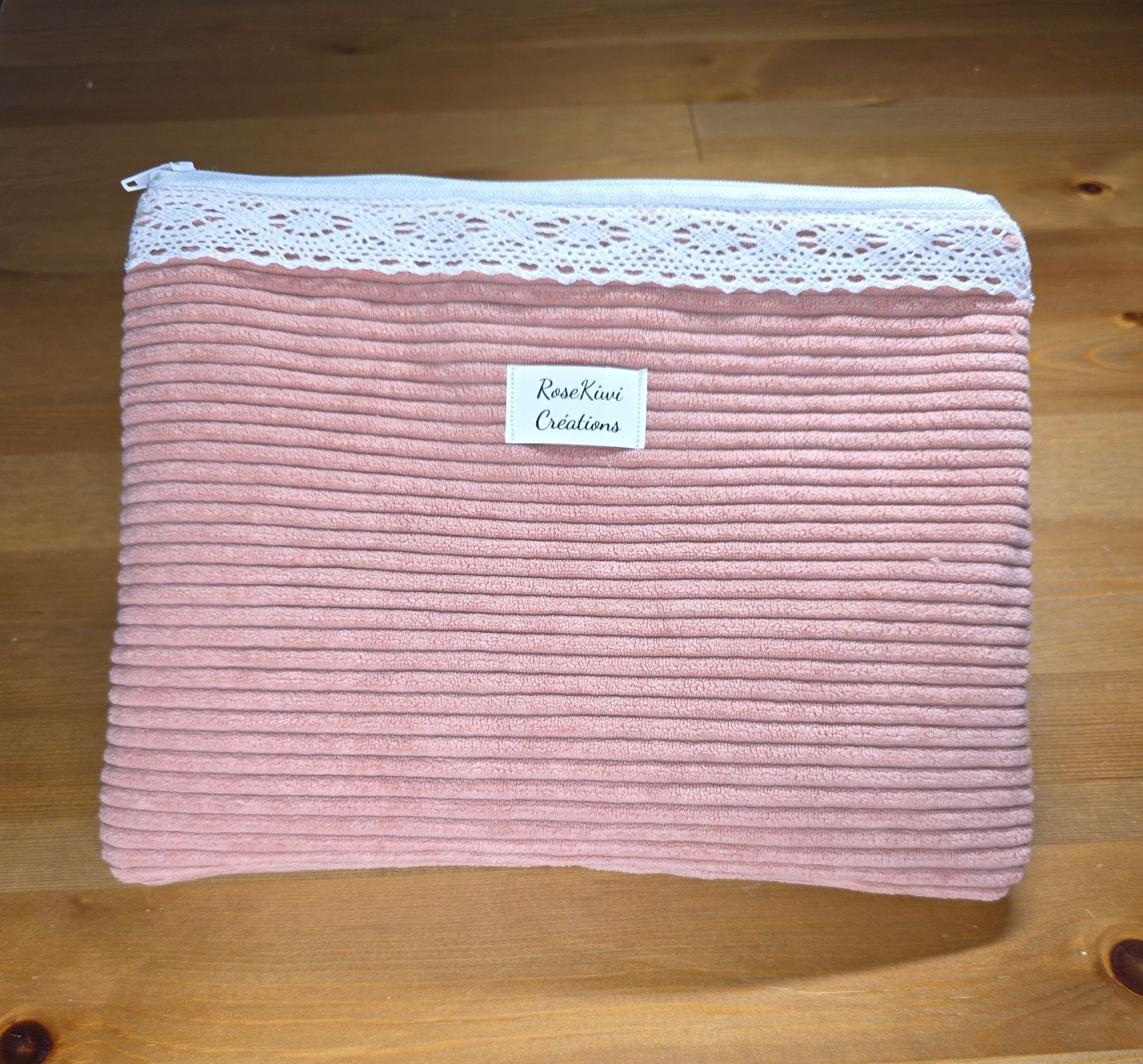 Pochette "Mona" zippée en velours côtelé rose poudré – doublure fleurie, finition dentelle blanche