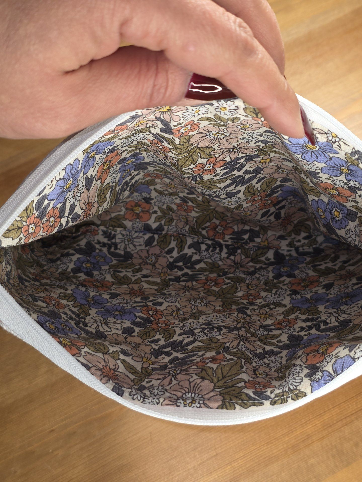 Trousse en velours côtelé couleurs rouille (entre le marron et le orange) et bordure fleurie ton sur ton