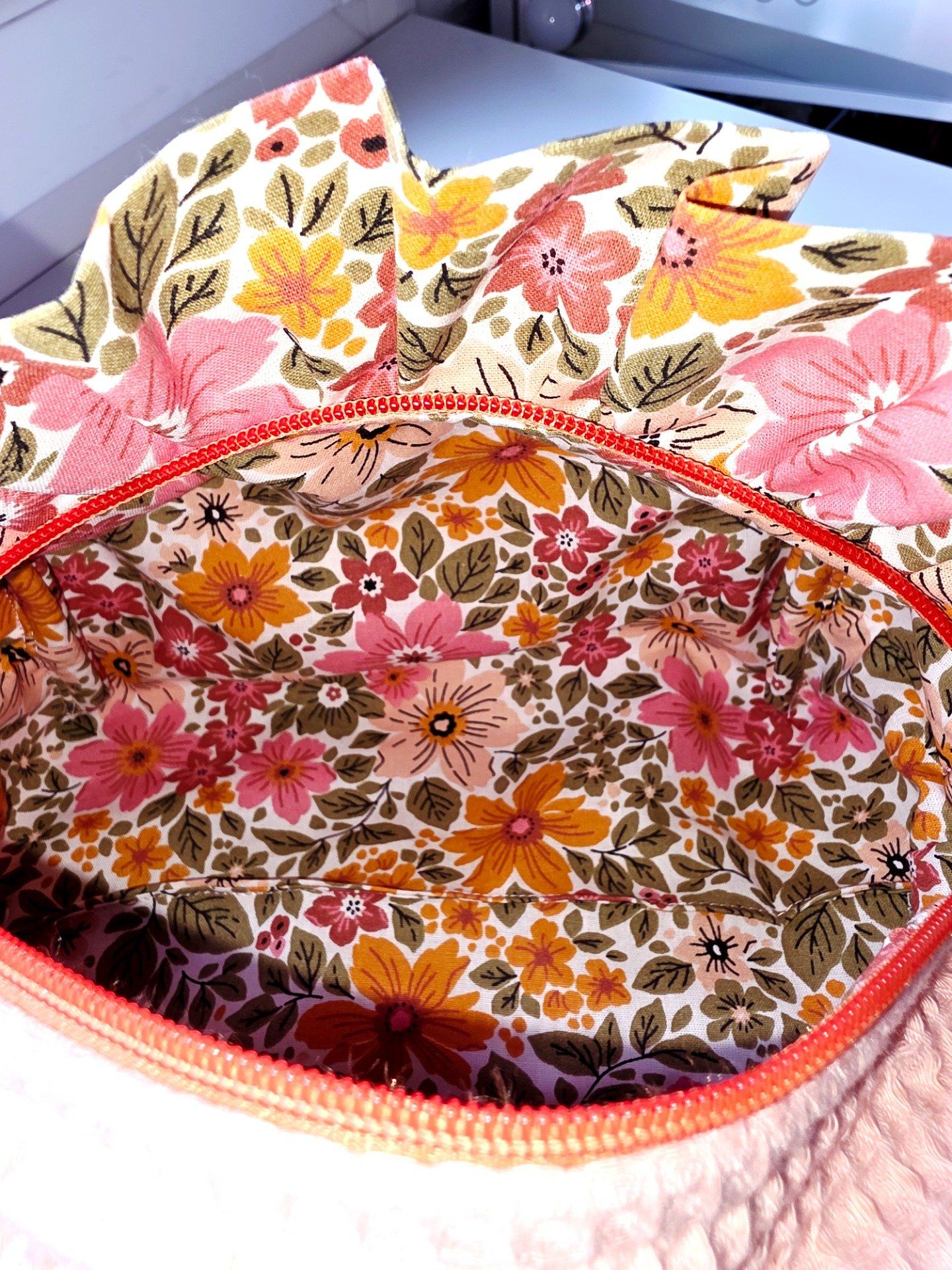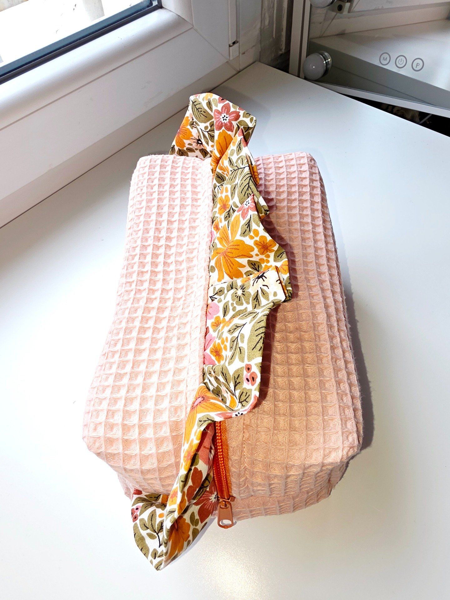 Trousse de toilette molletonnée en nid d’abeille rose poudré et froufrou